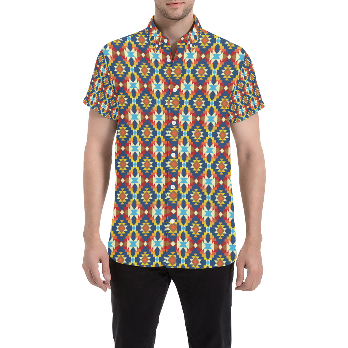 Aztec Pattern Print Design 01 Men's Short Sleeve Button Up Shirt Made to Order Item. It is hand-cut and sewn just for your order! This process starts as soon as your order is placed and may have a processing time of 5-9 business days before it ships.