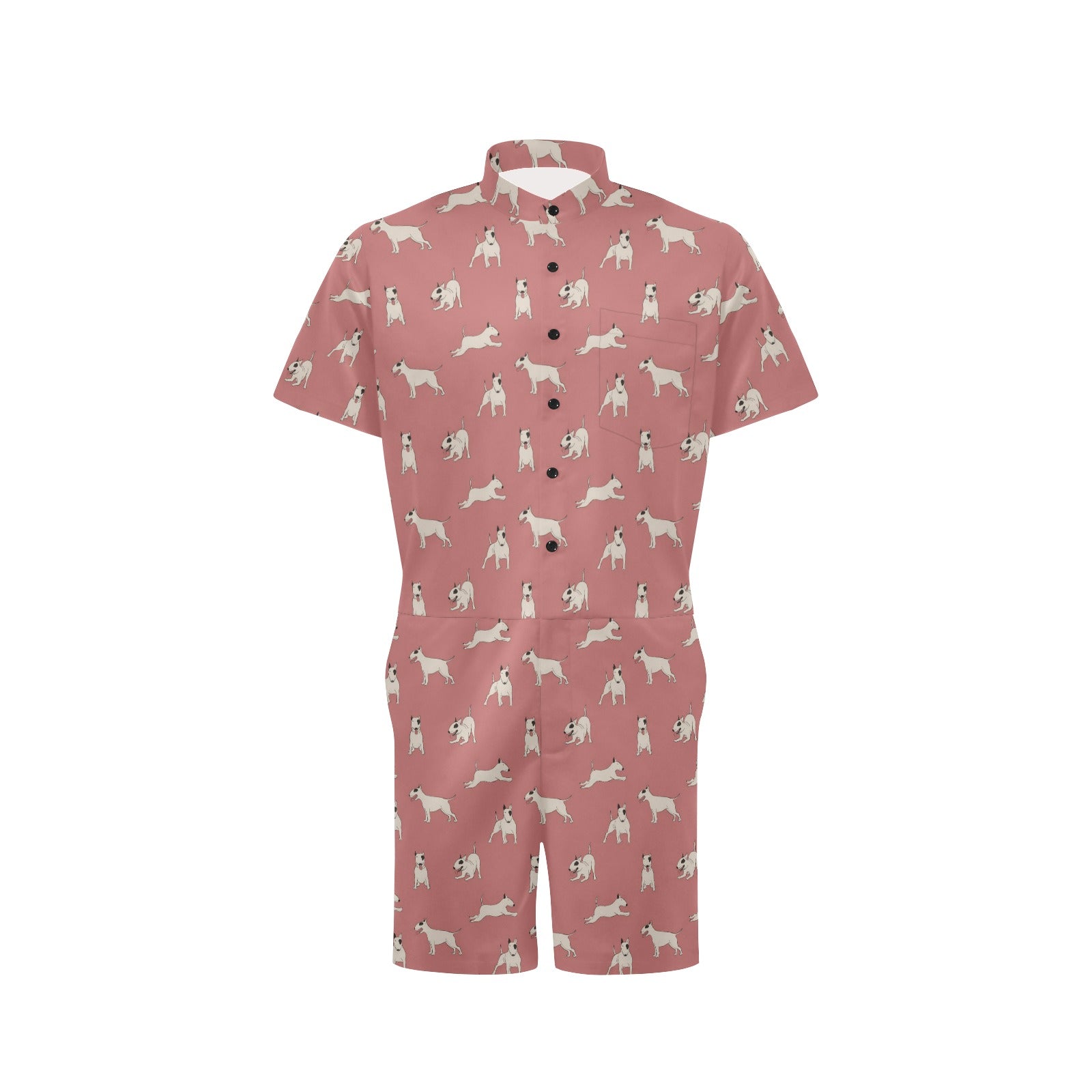 Bull Terriers Pattern Print Design 09 Men's Romper Made to Order Item. It is hand-cut and sewn just for your order! This process starts as soon as your order is placed and may have a processing time of 5-9 business days before it ships.