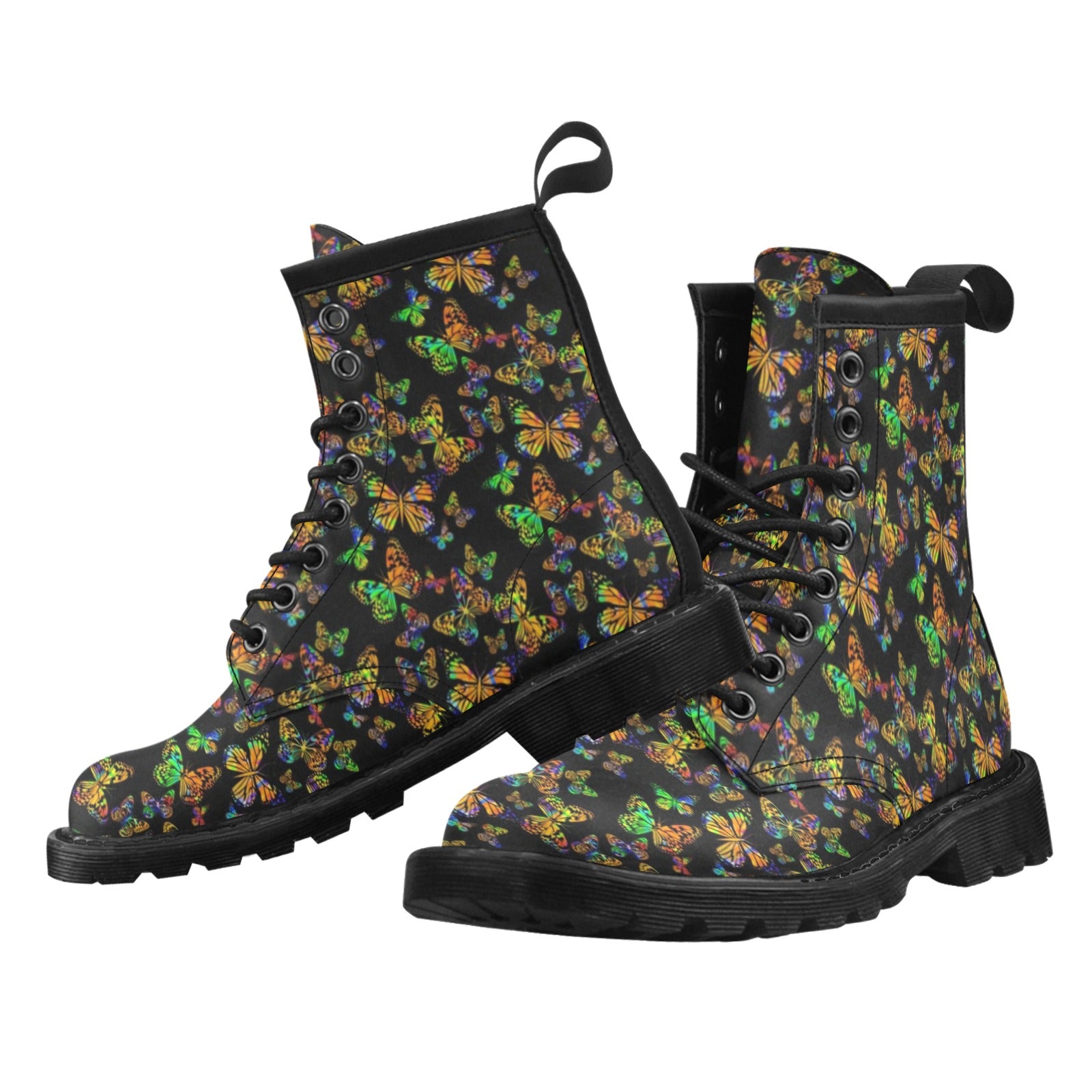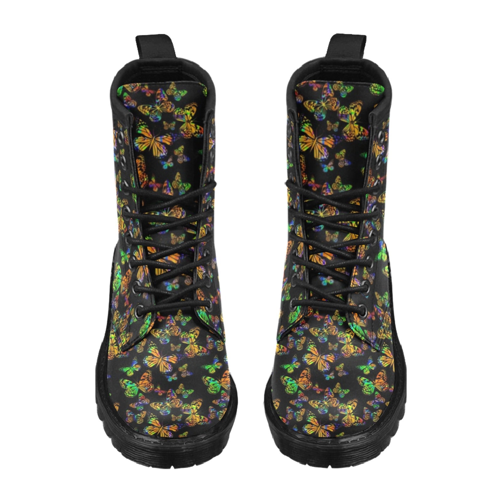Butterfly Neon Color Print Pattern Women's Boots Made to Order Item. It is hand-cut and sewn just for your order! This process starts as soon as your order is placed and may have a processing time of 5-9 business days before it ships.