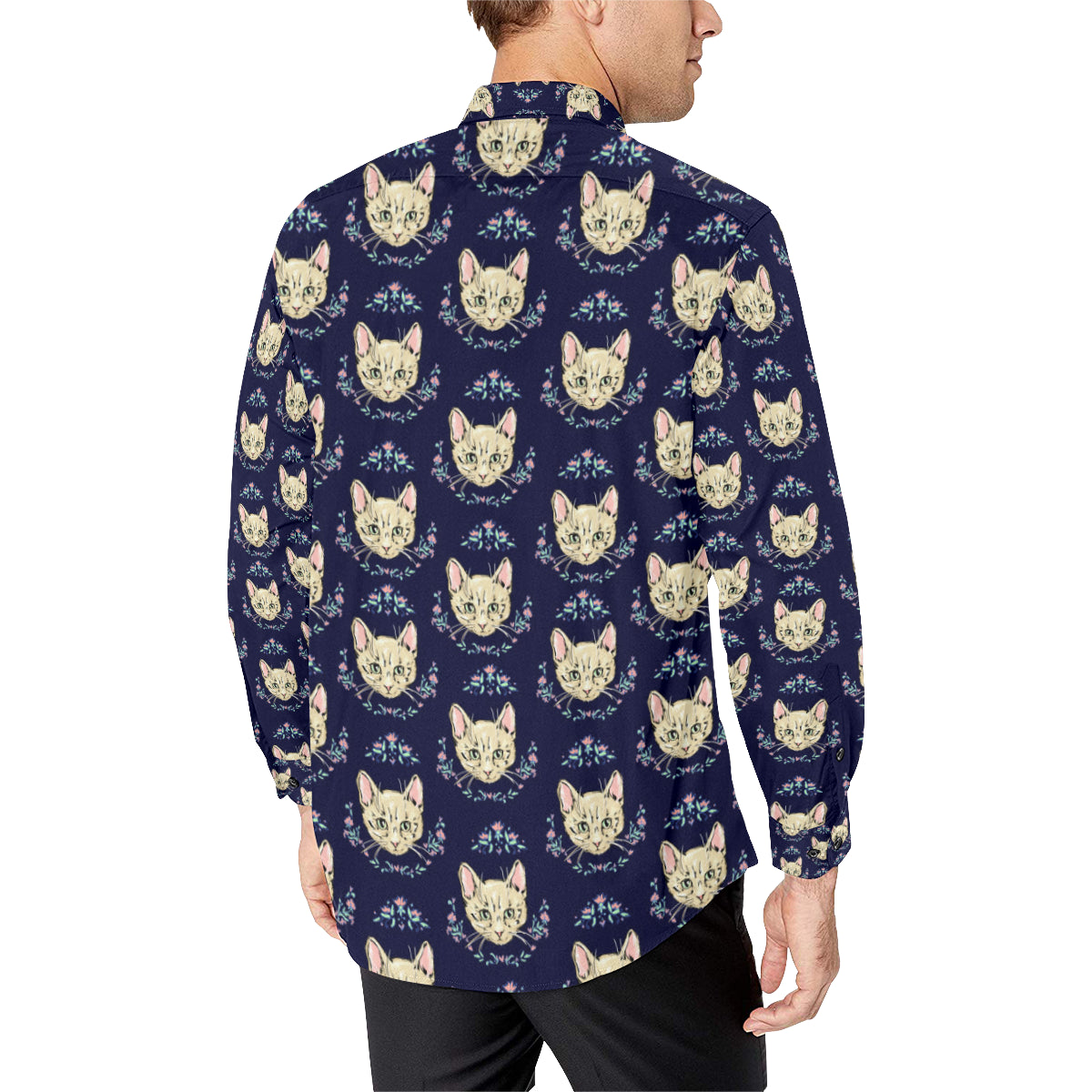 Cat Head with flower Print Pattern Men's Long Sleeve Shirt