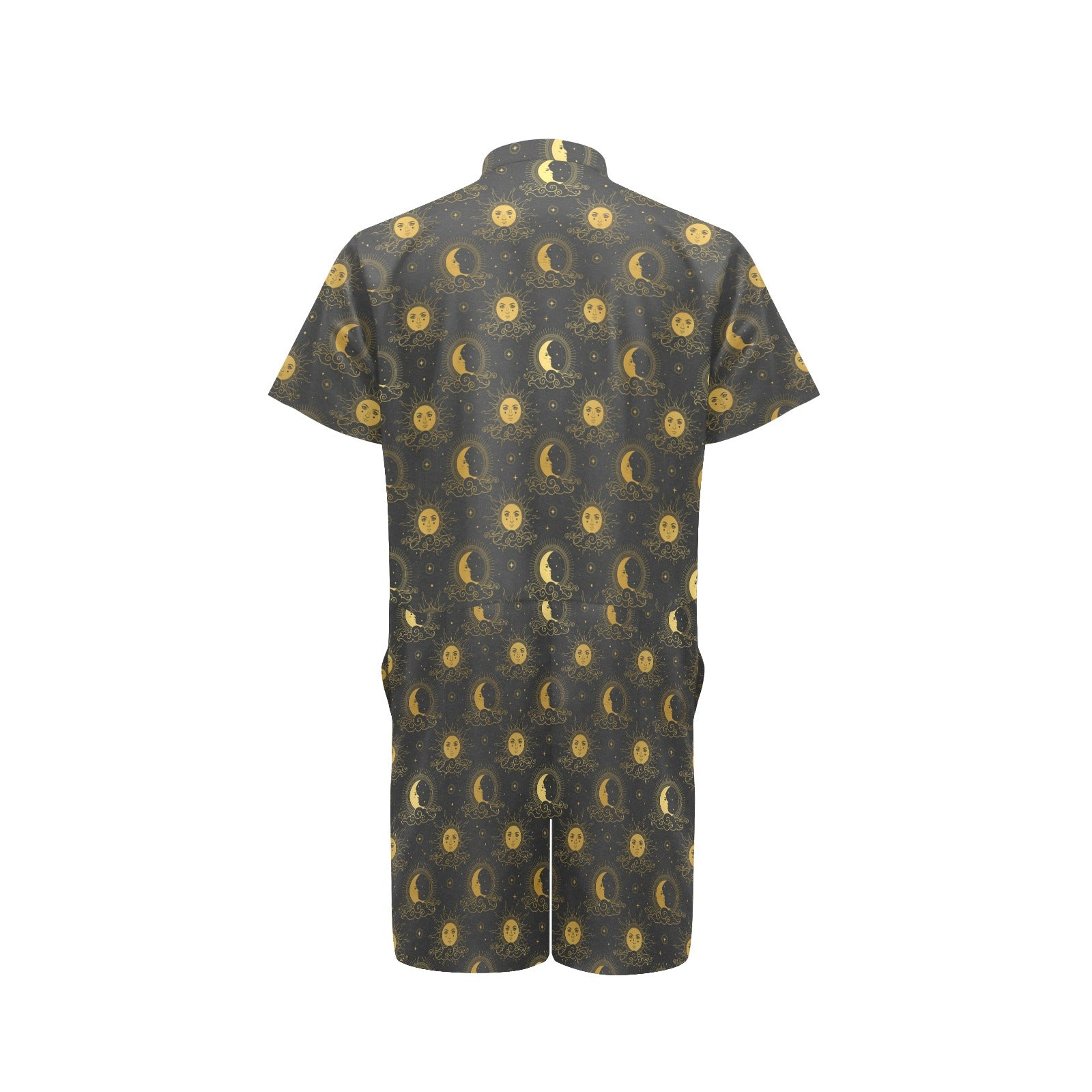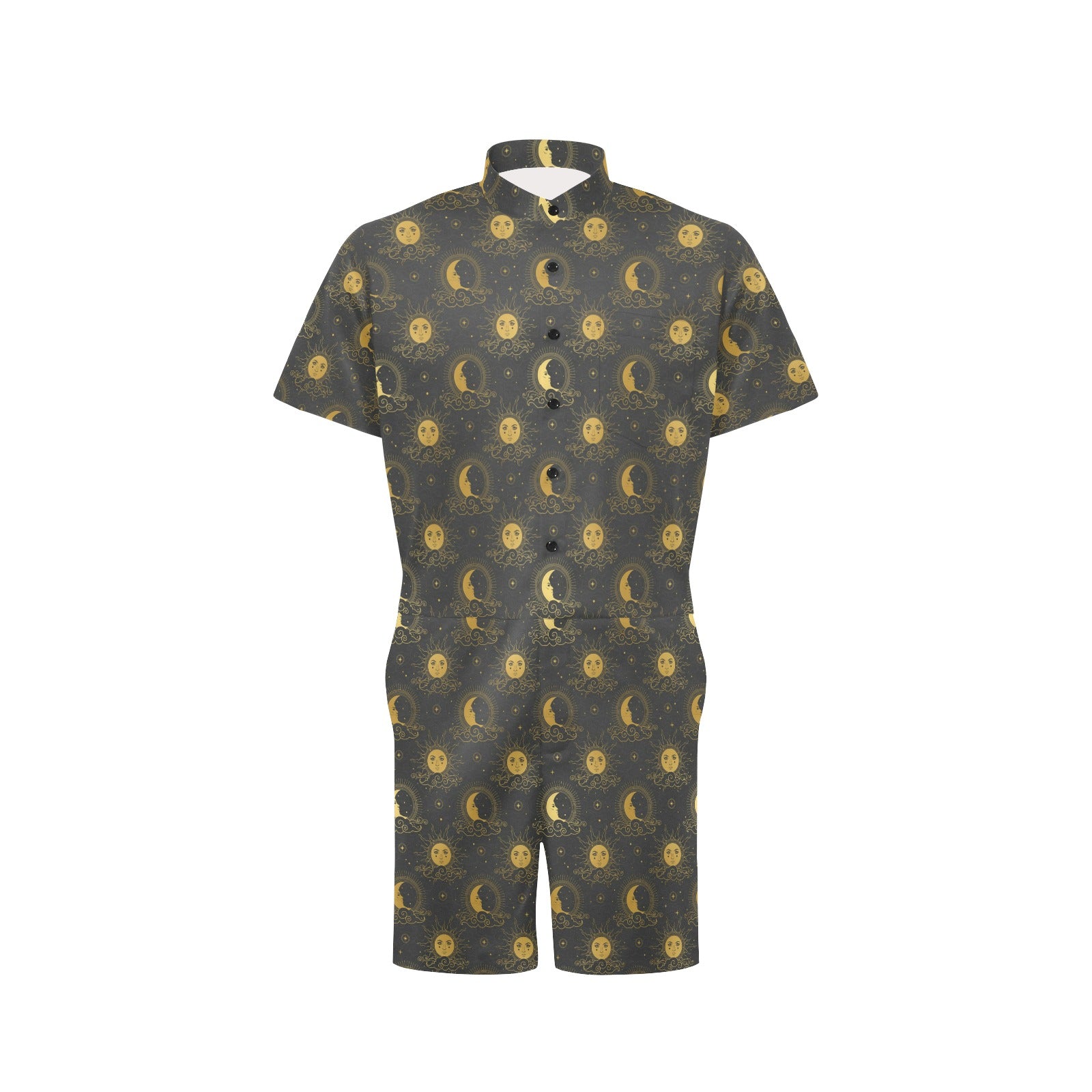 Celestial Moon Sun Pattern Print Design 05 Men's Romper Made to Order Item. It is hand-cut and sewn just for your order! This process starts as soon as your order is placed and may have a processing time of 5-9 business days before it ships.