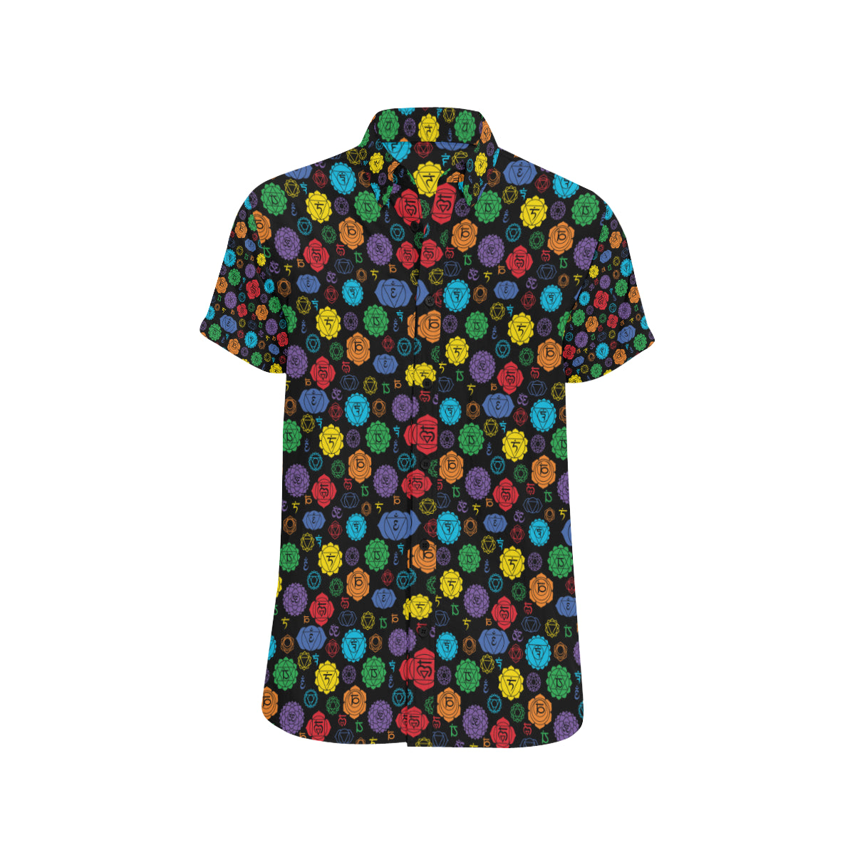 Chakra Pattern Print Design 01 Men's Short Sleeve Button Up Shirt Made to Order Item. It is hand-cut and sewn just for your order! This process starts as soon as your order is placed and may have a processing time of 5-9 business days before it ships.
