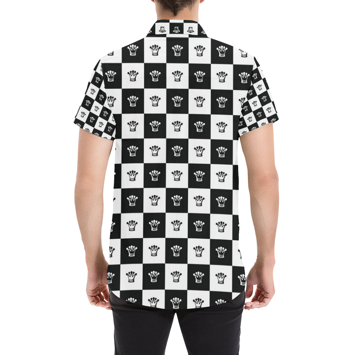 Checkered Flag Crown Pattern Men's Short Sleeve Button Up Shirt Made to Order Item. It is hand-cut and sewn just for your order! This process starts as soon as your order is placed and may have a processing time of 5-9 business days before it ships.