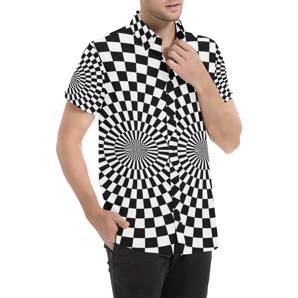 Checkered Flag Optical illusion Men's Short Sleeve Button Up Shirt Made to Order Item. It is hand-cut and sewn just for your order! This process starts as soon as your order is placed and may have a processing time of 5-9 business days before it ships.