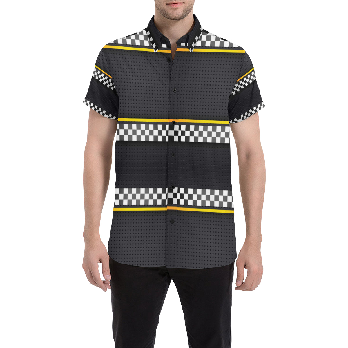 Checkered Flag Yellow Line Style Men's Short Sleeve Button Up Shirt Made to Order Item. It is hand-cut and sewn just for your order! This process starts as soon as your order is placed and may have a processing time of 5-9 business days before it ships.
