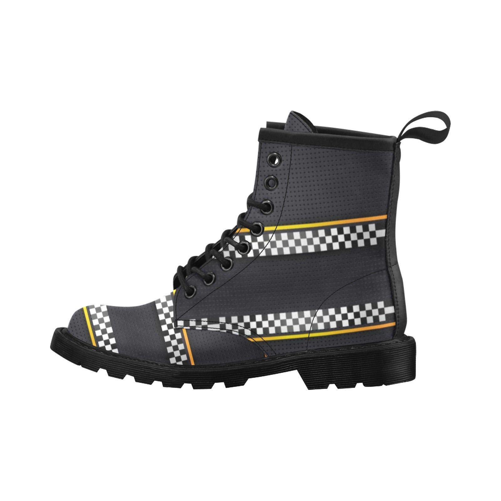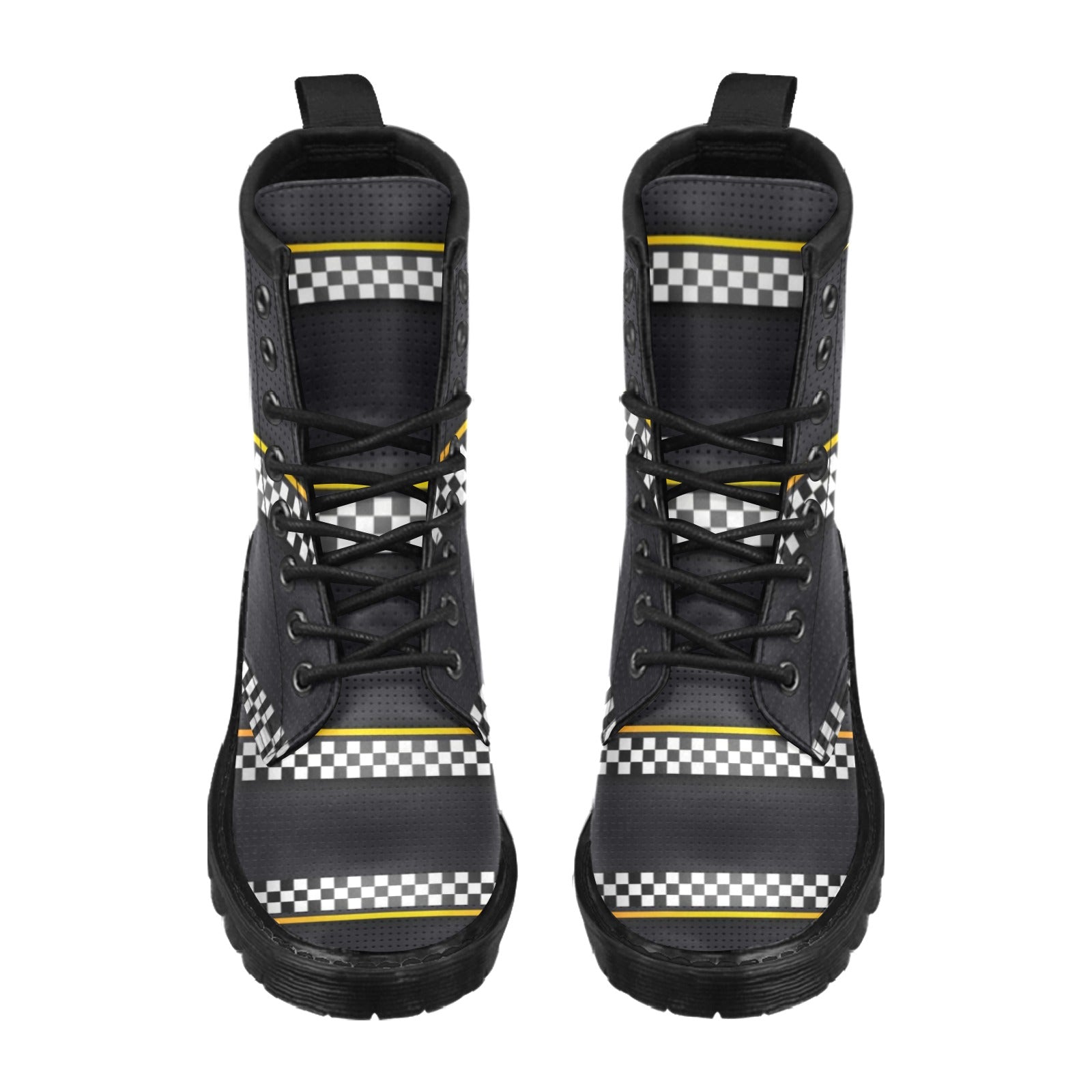 Checkered Flag Yellow Line Style Women's Boots Made to Order Item. It is hand-cut and sewn just for your order! This process starts as soon as your order is placed and may have a processing time of 5-9 business days before it ships.
