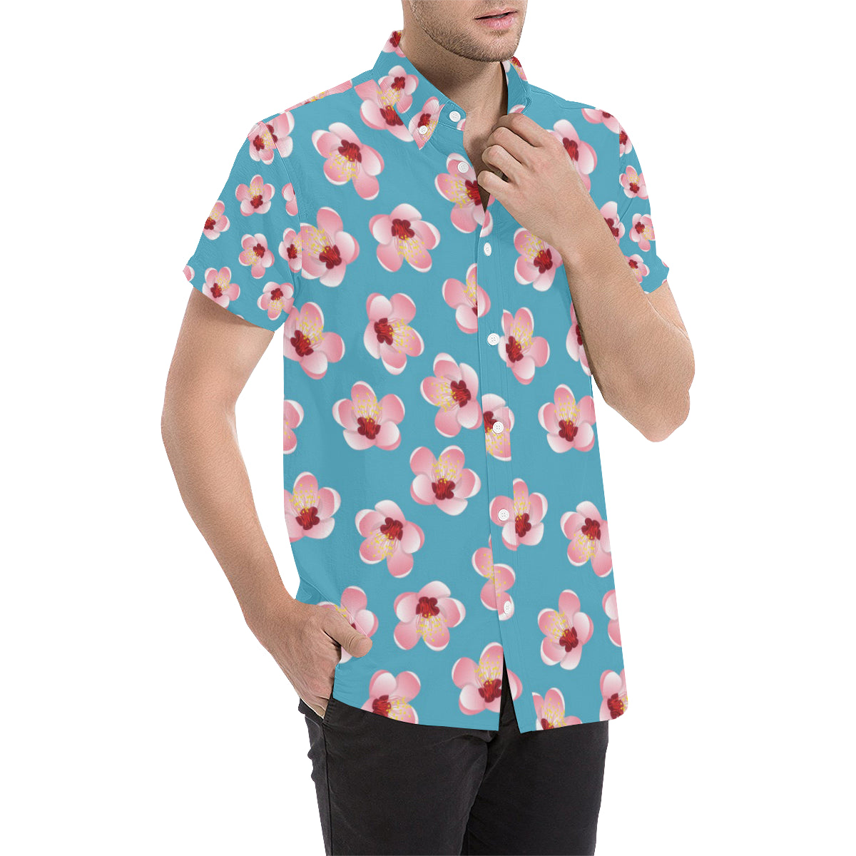 Cherry Blossom Pattern Print Design CB09 Men's Short Sleeve Button Up Shirt Made to Order Item. It is hand-cut and sewn just for your order! This process starts as soon as your order is placed and may have a processing time of 5-9 business days before it ships.