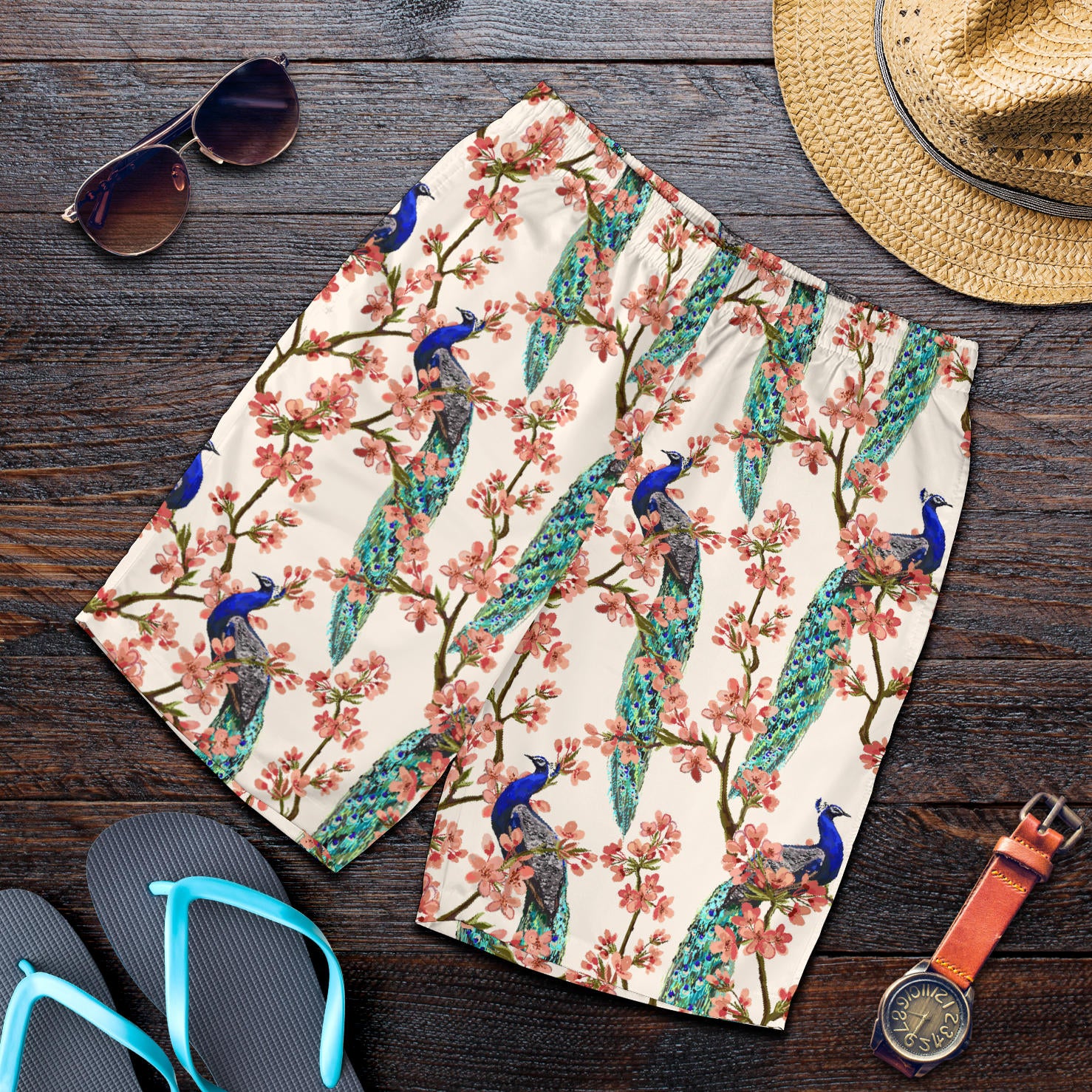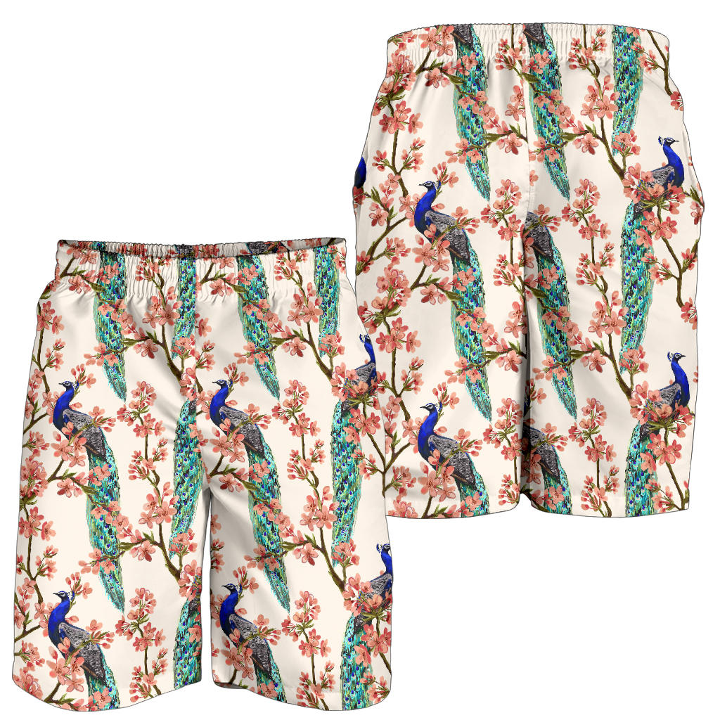 Cherry Blossom Peacock Mens Shorts Made to Order Item. It is hand-cut and sewn just for your order! This process starts as soon as your order is placed and may have a processing time of 5-9 business days before it ships.