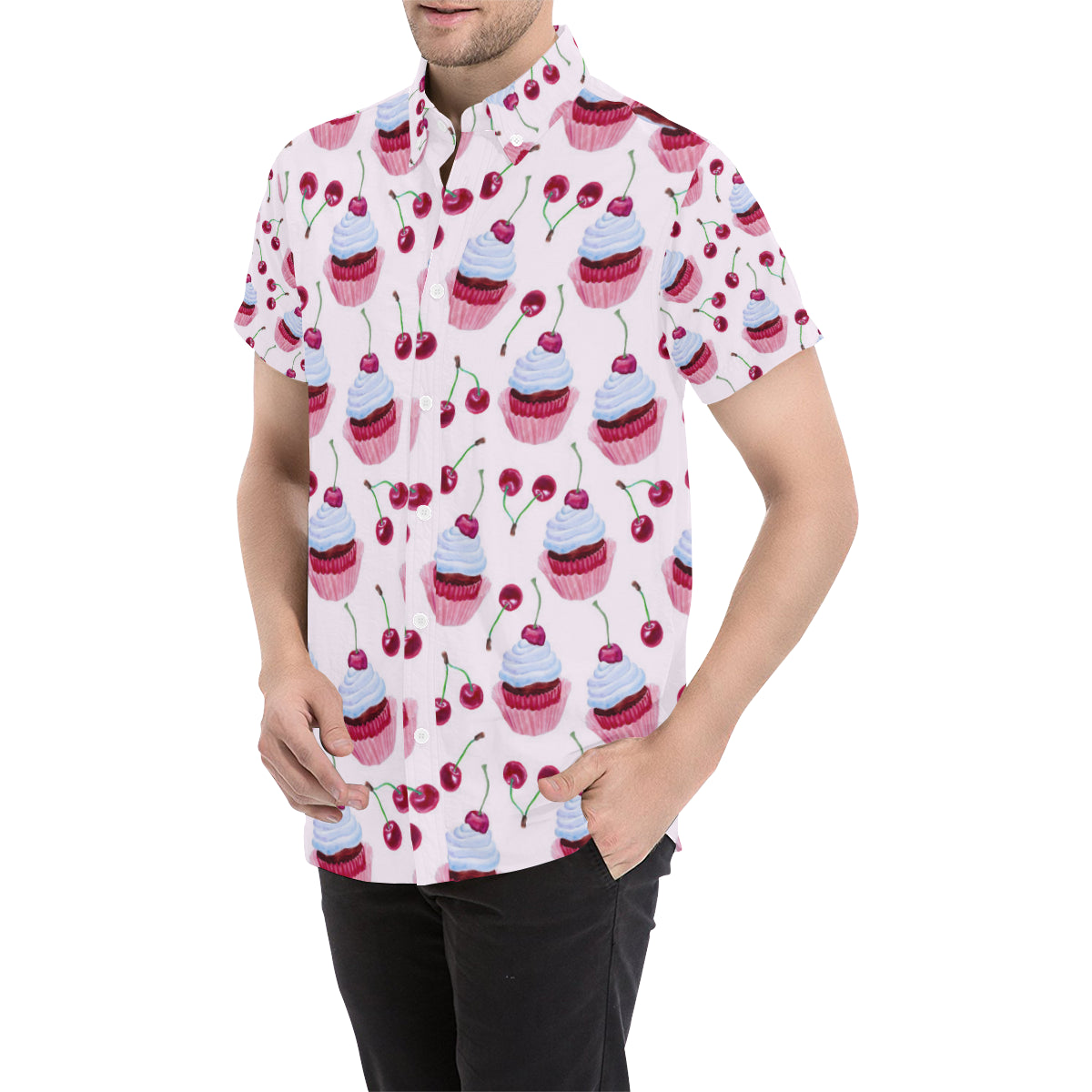 Cherry Cupcake Pink Pattern Men's Short Sleeve Button Up Shirt Made to Order Item. It is hand-cut and sewn just for your order! This process starts as soon as your order is placed and may have a processing time of 5-9 business days before it ships.