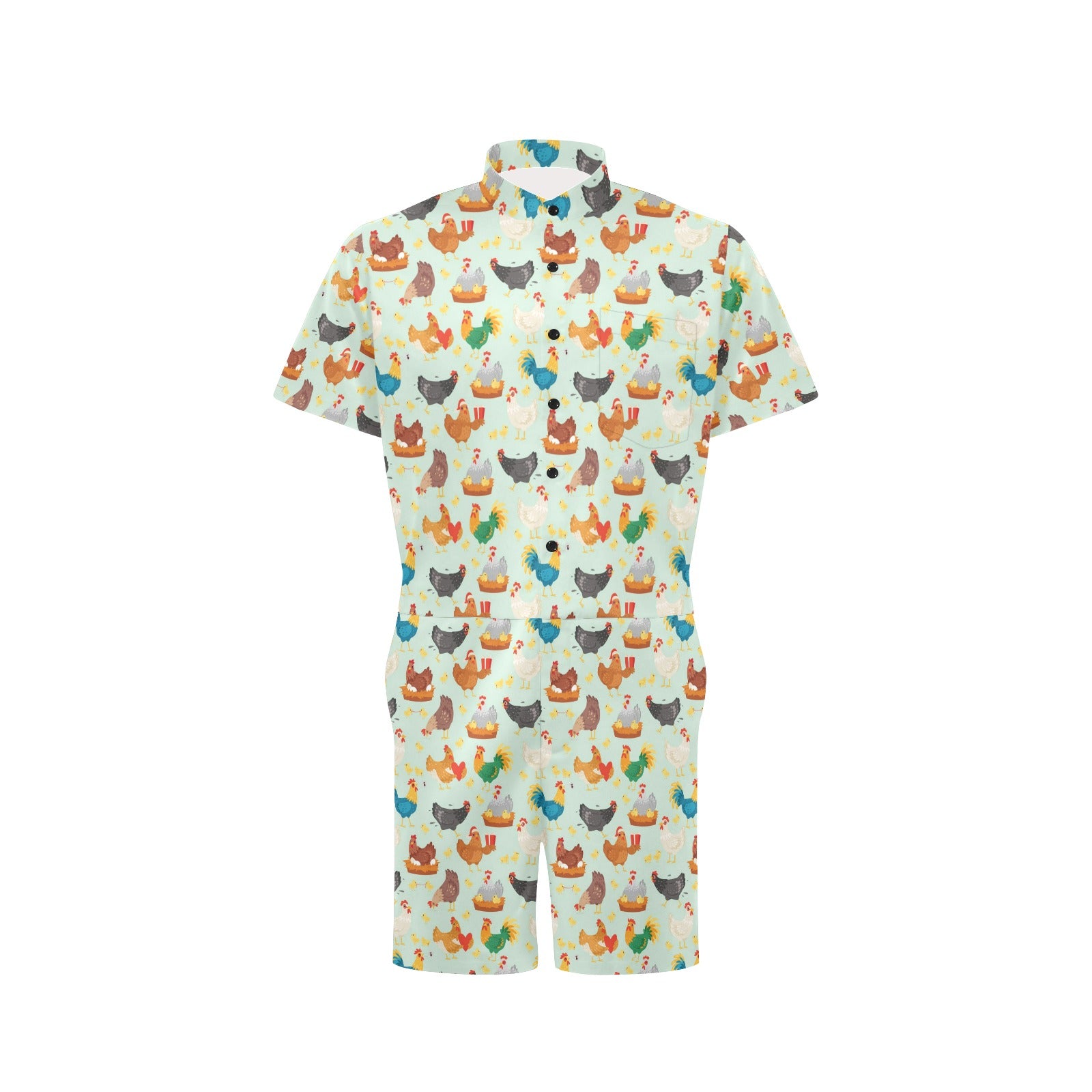 Chicken Pattern Print Design 07 Men's Romper Made to Order Item. It is hand-cut and sewn just for your order! This process starts as soon as your order is placed and may have a processing time of 5-9 business days before it ships.
