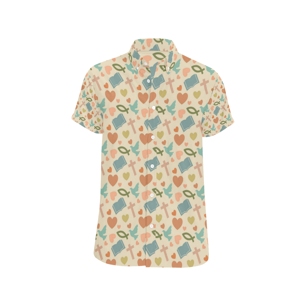 Christian Symbol Pattern Men's Short Sleeve Button Up Shirt Made to Order Item. It is hand-cut and sewn just for your order! This process starts as soon as your order is placed and may have a processing time of 5-9 business days before it ships.