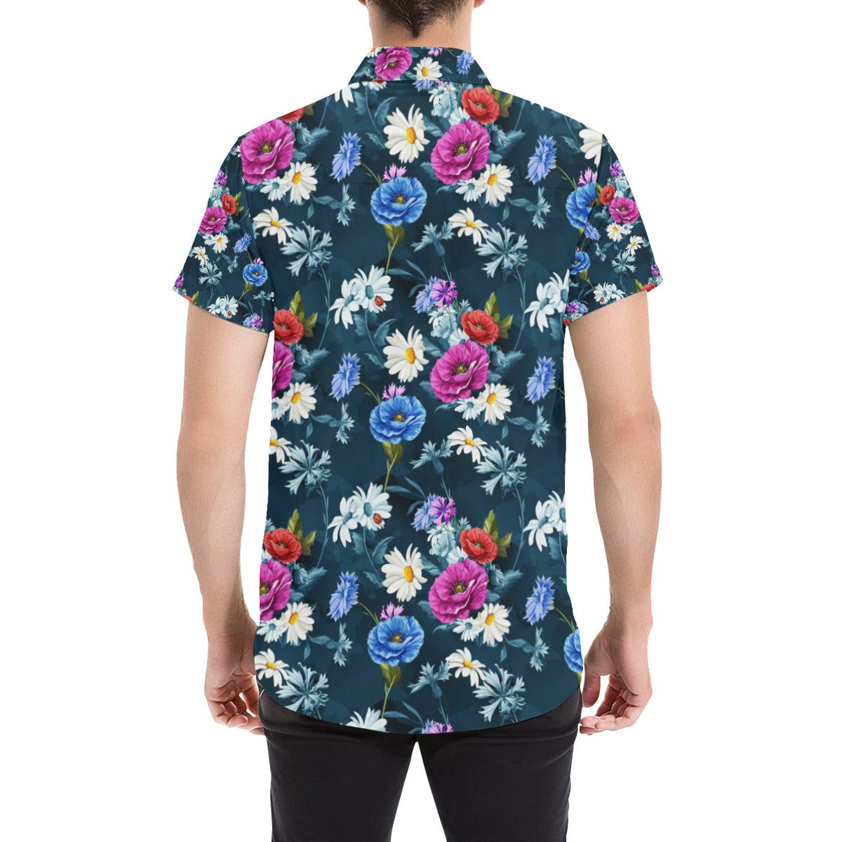 Floral Blue Themed Print Men's Short Sleeve Button Up Shirt Made to Order Item. It is hand-cut and sewn just for your order! This process starts as soon as your order is placed and may have a processing time of 5-9 business days before it ships.